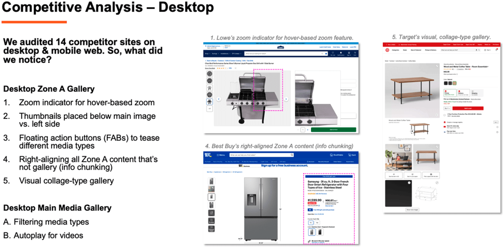 I audited 14 competitor sites across desktop, mobile web, and app to benchmark media gallery experiences.